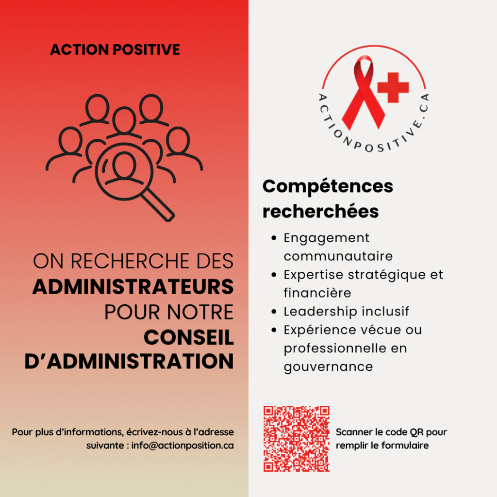 ACTION POSITIVE est à la recherche de nouvelles voix pour rejoindre son conseil d’administration et contribuer à l’orientation stratégique de l’organisme. Si vous êtes passionné·e par les enjeux liés au VIH en Ontario et souhaitez jouer un rôle actif dans la gouvernance d’un organisme engagé, cette opportunité est pour vous.